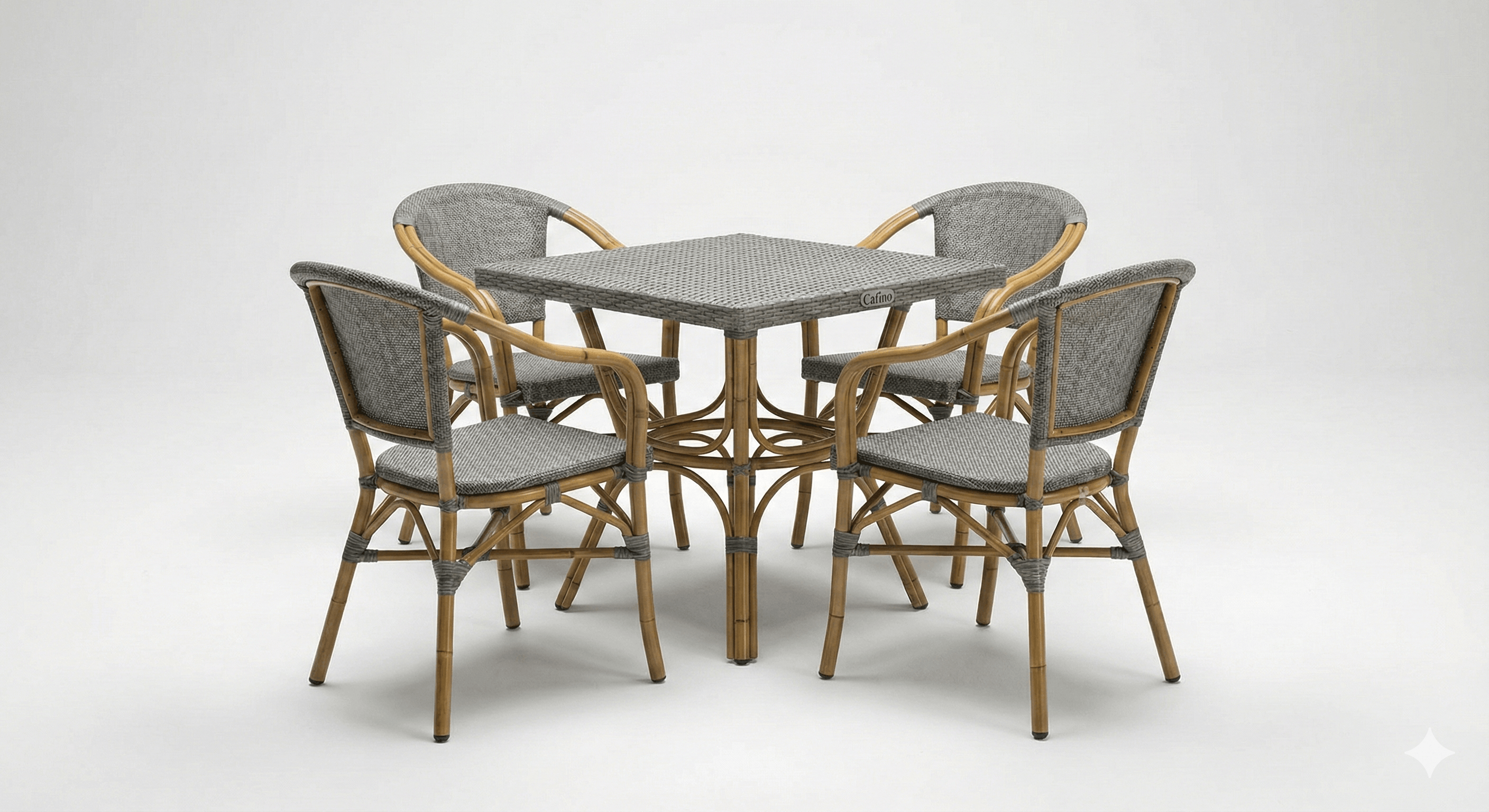 An outdoor set consisting of four steel chairs and a square table with a 6 mm beveled clear-glass top, made from electrostatic-coated steel suitable for outdoor commercial settings.